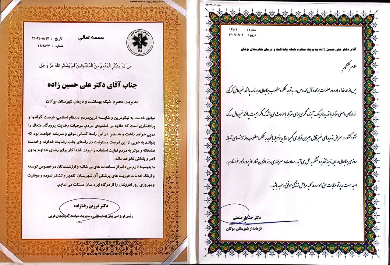 تقدیر از تلاش‌های مدیر شبکه بهداشت و درمان شهرستان بوکانمهندس خشایار صنعتی، فرماندار شهرستان بوکان و دکتر فرزین رضا‌زاده رئیس اورژانس پیش‌بیمارستانی استان آذربایجان غربی، طی لوح‌هایی جداگانه از خدمات ارزنده دکتر علی حسین‌زاده، مدیر شبکه بهداشت و درمان شهرستان بوکان، تقدیر و تجلیل به‌عمل آوردند.مهندس صنعتی از تلاش‌های مستمر و شبانه‌روزی دکتر حسین‌زاده در پیشبرد برنامه‌های پدافند غیرعامل شهرستان تجلیل کرد. وی اقدامات ایشان را در زمینه تقویت زیرساخت‌های پدافندی، ارتقاء آمادگی مقابله با تهدیدات، و ایجاد ظرفیت‌های آینده‌نگر در حوزه سلامت، شایسته تقدیر دانست و نقش ایشان را در تحقق اهداف راهبردی این حوزه، مؤثر و الهام‌بخش ارزیابی کرد.همچنین دکتر رضا‌زاده با اشاره به مساعدت‌های بی‌دریغ و ارزشمند ایشان در توسعه و ارتقاء خدمات فوریت‌های پزشکی شهرستان، نقش دکتر حسین‌زاده را در بهبود زیرساخت‌های امدادی و ارتقاء سطح پاسخ‌گویی اورژانس ستود.